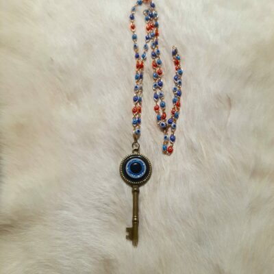 Voici une pièce qui ne se contente pas d’orner le cou, elle raconte une histoire. La Clé Solaire Nazar unit la symbolique ancestrale de la clé et la puissance protectrice de l’œil. Suspendue à une chaîne délicatement parsemée de perles aux nuances bleu profond, azur céleste et rouge vibrant, elle capte la lumière et semble la faire danser à chacun de vos mouvements.