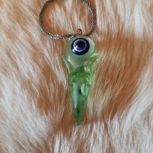 Ce pendentif unique, façonné en époxy vert translucide, incarne la puissance du corbeau gardien alliée à la protection de l’Œil grec. Placé en façade, l’œil agit comme un rempart contre le mauvais sort et les influences négatives, préservant la bonne fortune de son porteur.