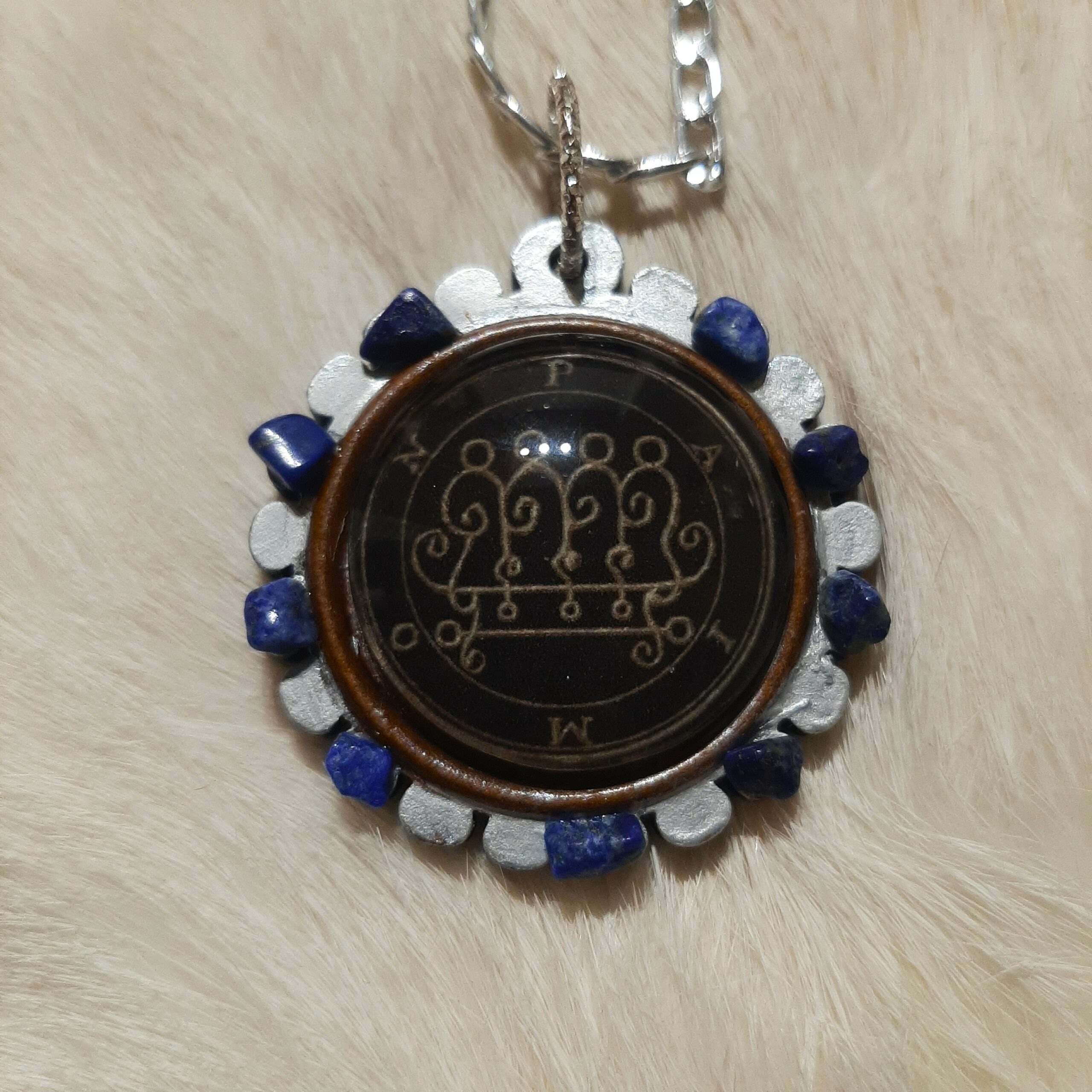 Autour du sceau, neuf pierres de lapis-lazuli forment une couronne énergétique. Ce nombre sacré – le 9 – symbolise l’accomplissement, la sagesse universelle et la puissance de réalisation. Le lapis-lazuli, pierre des rois et des prophètes, renforce l’intuition, la clarté mentale et la communication inspirée – qualités étroitement liées à l’influence de Paimon.