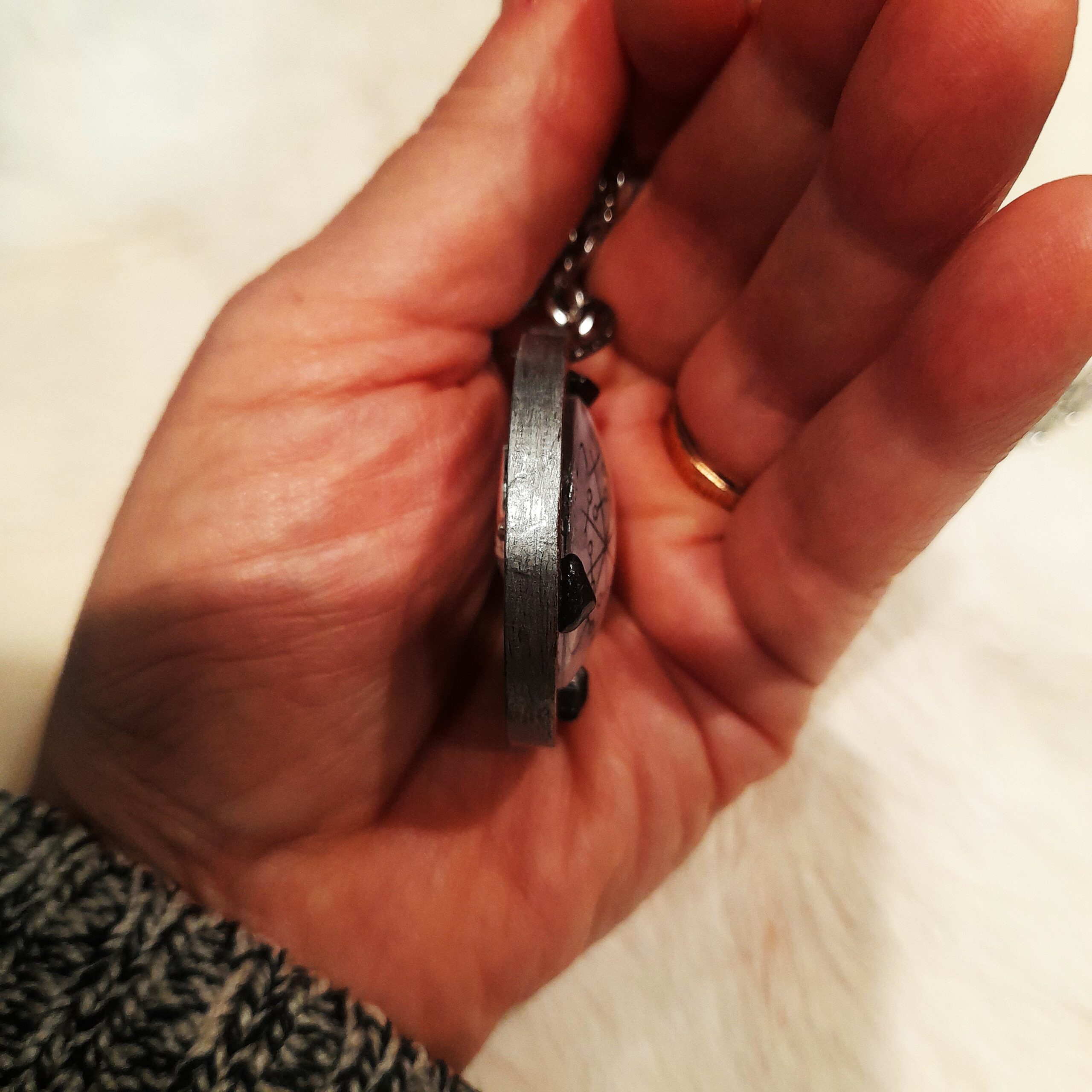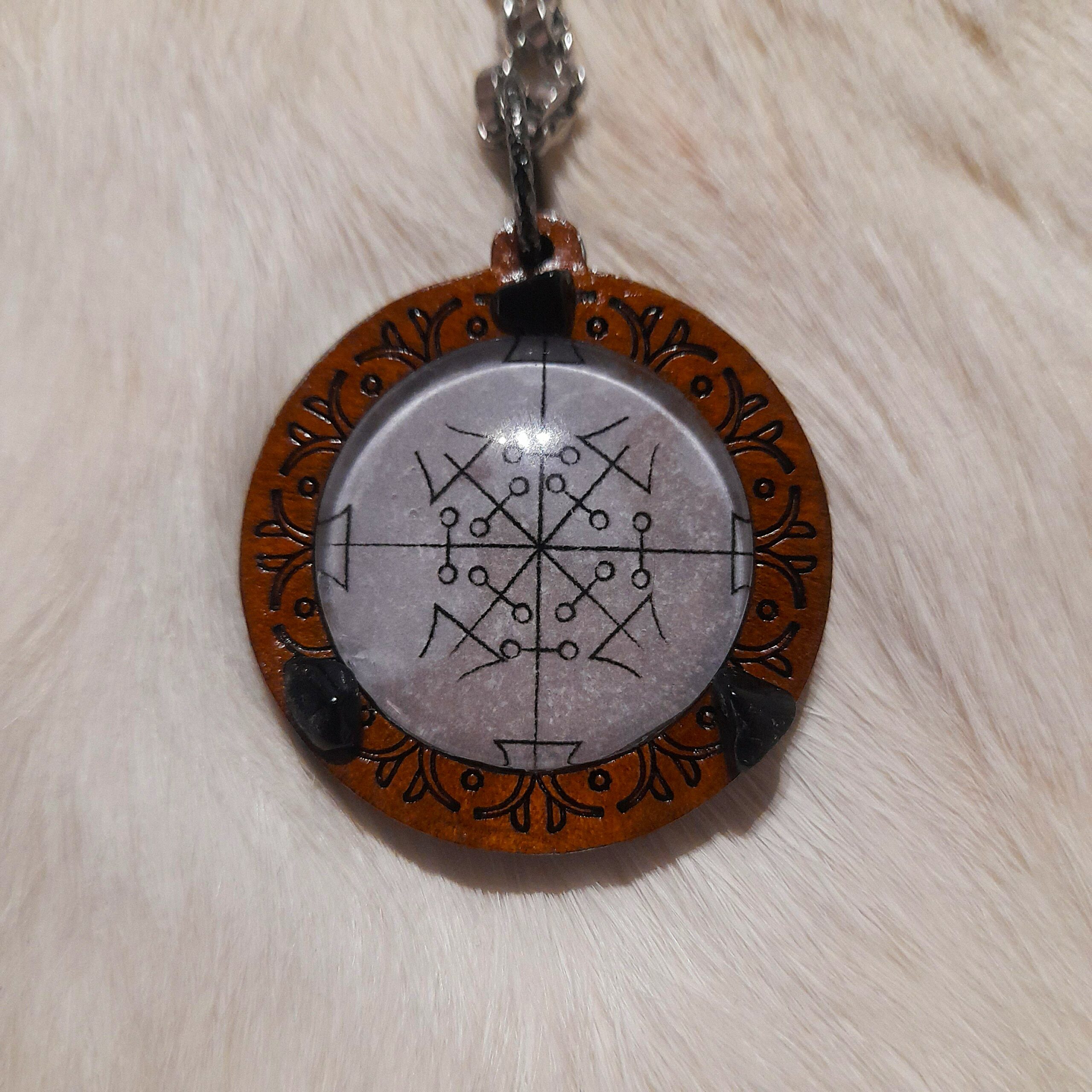 Son support circulaire en bois naturel accueille un sigil d’Hécate, protégé sous une couche d’époxy. Ce sceau agit comme un seuil entre les mondes, permettant de concentrer l’énergie rituelle, d’ouvrir les visions et de guider les méditations. Trois obsidiennes noires, posées avec intention, forment un triangle protecteur, absorbant les énergies discordantes, révélant les vérités cachées et soutenant le travail de l’ombre, si cher à Hécate.